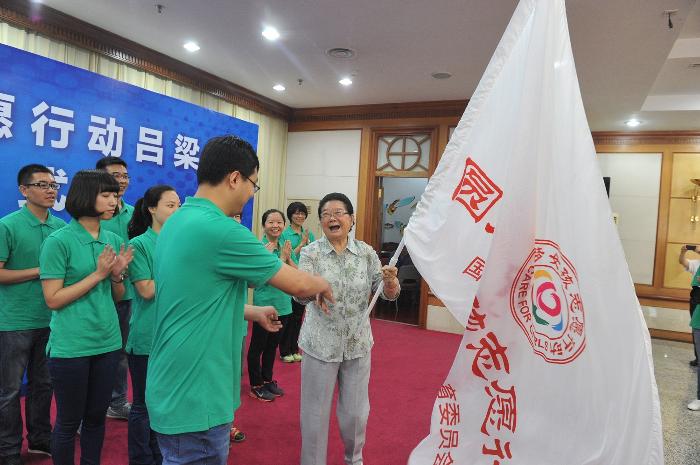 第十届全国人大常委会副委员长、中国关心下一代工作委员会主任、中国下一代教育基金会名誉理事长顾秀莲为志愿者队伍授旗。